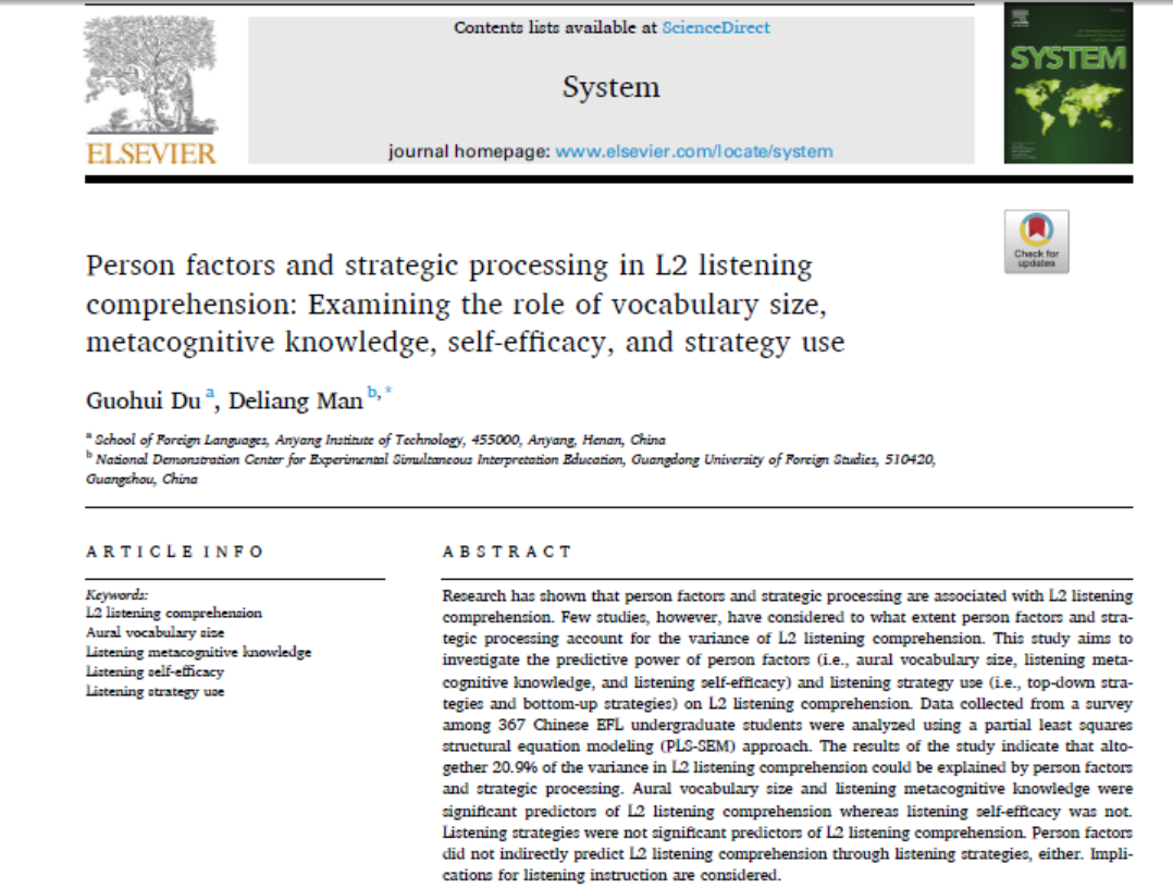 近日,公司williamhill中国官方网站教师杜国辉(马来亚大学博士,河南科技公司硕士生导师)以第一作者身份在SSCI中科院一区语言学期刊《System》发表1篇学术论文,论文题目为《Person factors and strategic processing in L2 listening comprehension: Examining the role of vocabulary size, metacognitive knowledge, self-efficacy, and strategy use》。