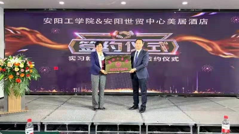 10月22日,williamhill中国官方网站与安阳世贸中心美居酒店在安阳世贸中心美居酒店二楼锦江厅举行空乘实习实训基地挂牌及签约仪式。安阳世贸中心美居酒店业主代表杨利霞,总经理陈明,总经理助理兼销售总监路建富,前厅经理李娟,williamhill中国官方网站经理李霞、副经理原斌华、副经理杜丽霞、各教研室主任及员工代表参加签约仪式。