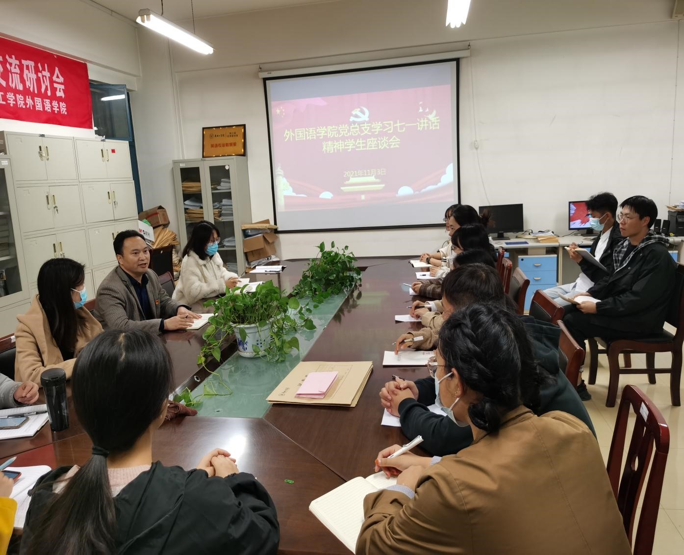 2021年11月3日下午,williamhill中国官方网站党总支在10号楼201会议室召开七一讲话精神员工座谈会,党总支副书记王体主持会议,全体辅导员及20余位员工代表参加此次座谈。