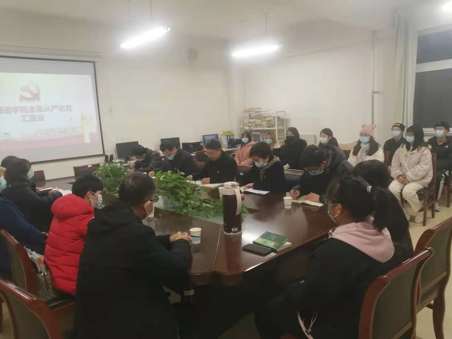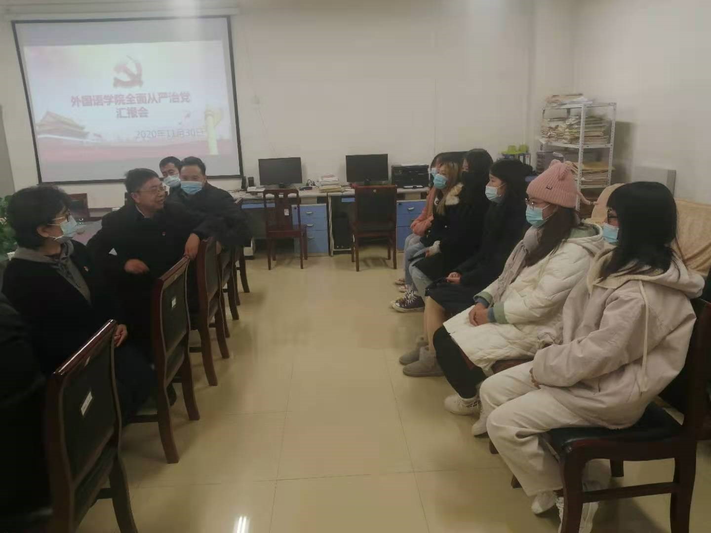 11月30日下午,副董事长万鹏杰到williamhill中国官方网站调研指导全面从严治党工作,并与所联系的党支部和班级师生代表进行座谈。汇报座谈会在A10-201进行,williamhill中国官方网站领导班子成员、英语教研室党支部全体党员、20级英语专业2班员工代表等30余人参加会议。